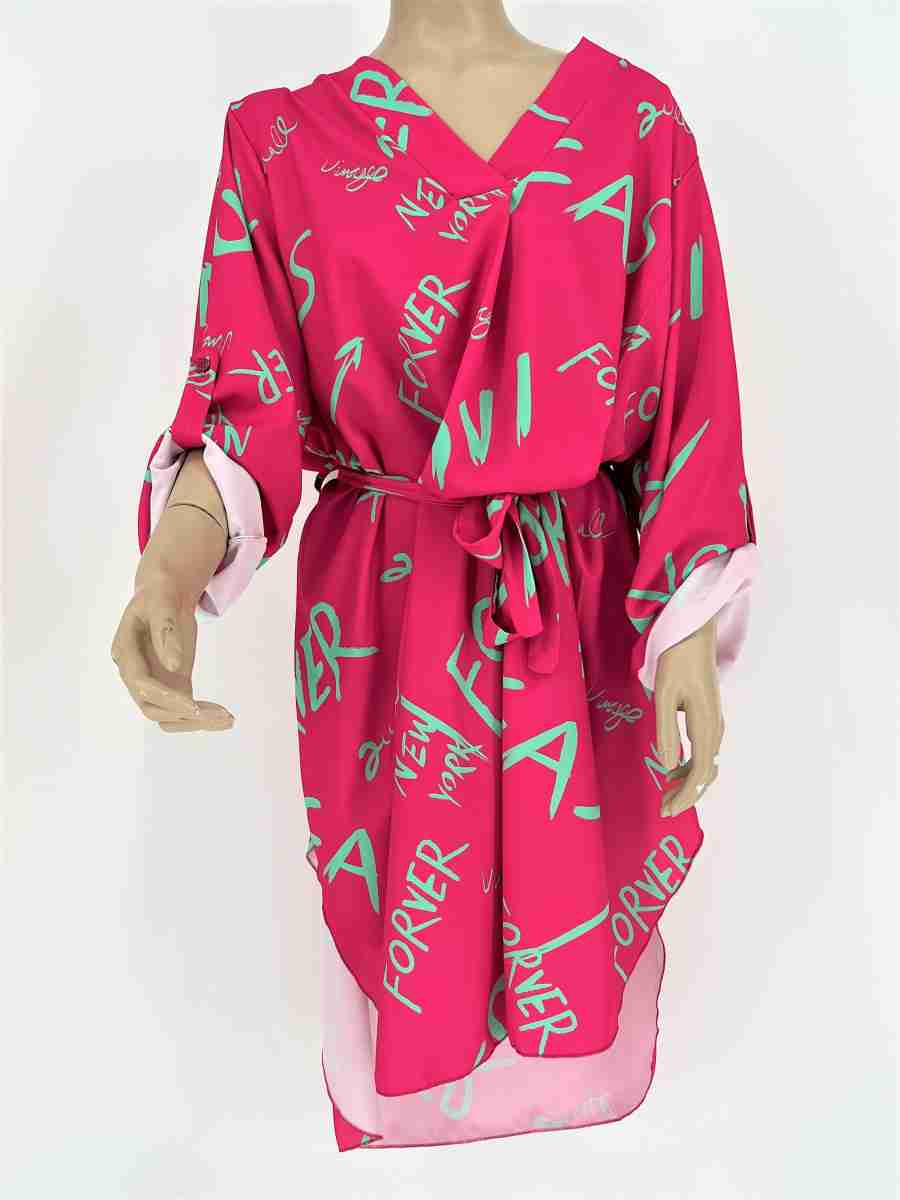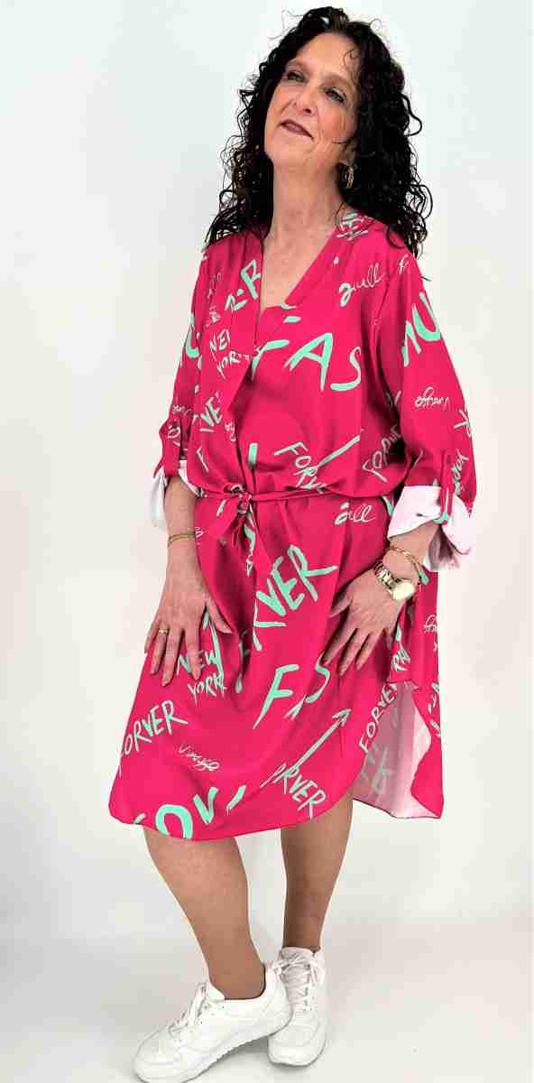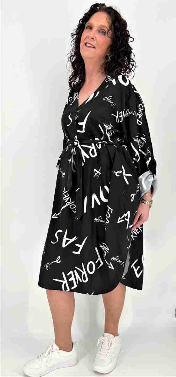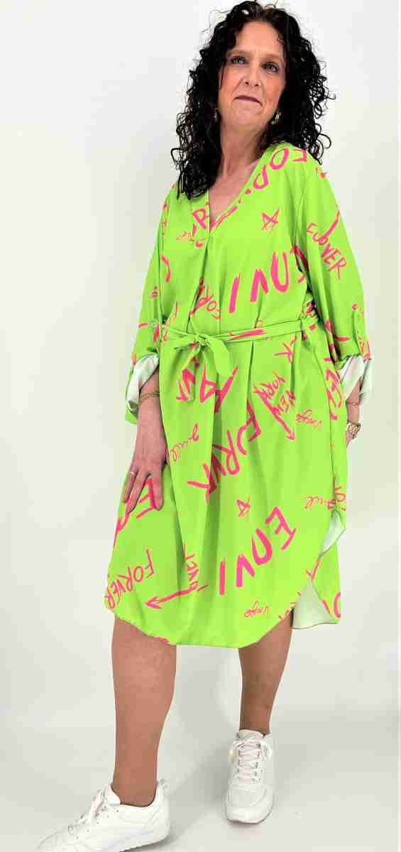 Deze jurk is super soepel en geweldig door de tekst en zowel los als met de ceintuur te dragen.