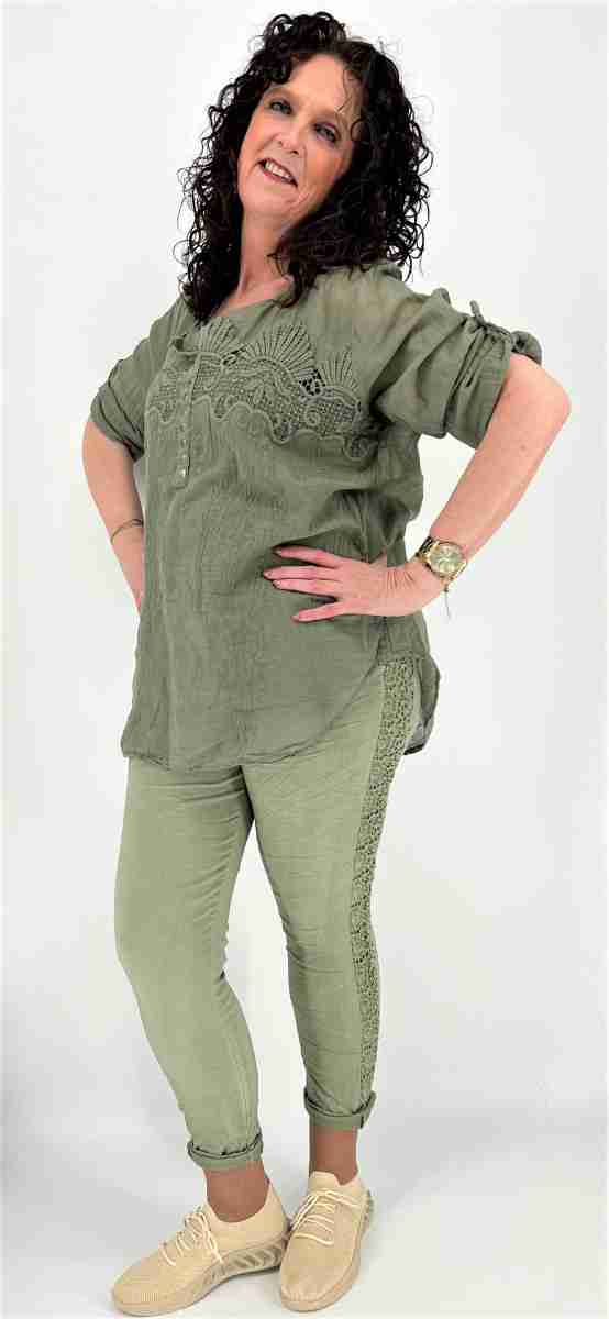 Draag den top op een spijkerbroek of stretchbroek maar op een korte broek , sneakers eronder en je outfit is helemaal af